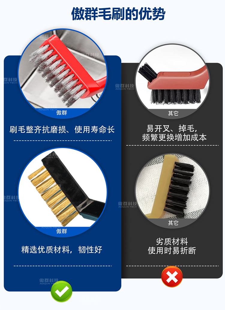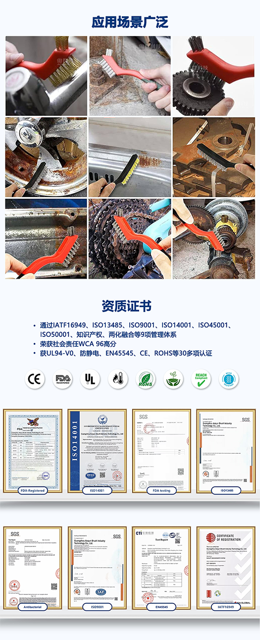 - 刷毛材質(zhì):高密度刷毛耐磨抗彎折,刷毛可選鋼絲、黃銅線、青銅線、馬鬃、豬毛、山羊絨、尼龍、聚丙烯、聚酯纖維等